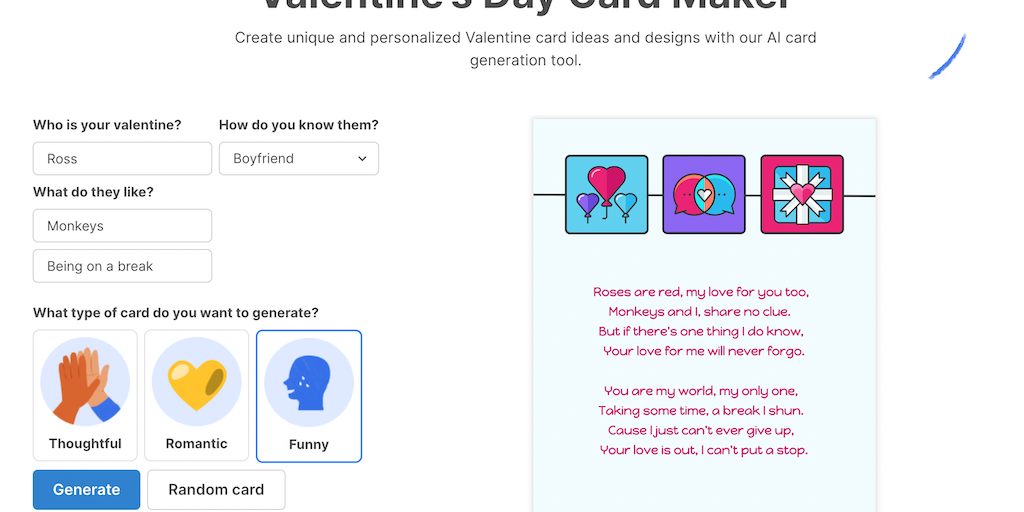 Create unique and personalized Valentine cards with our AI card generation tool. Want to send a funny poem to your secret crush? Use our GPT-3 powered, Cyrano de Bergerac-inspired card maker tool to e