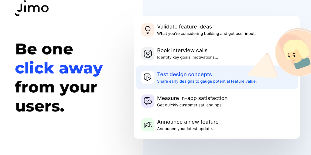 Jimo enables product teams to effortlessly connect with end-users at any step of the product lifecycle, from discovery and shaping to feature announcement. So you can build user-centric products that