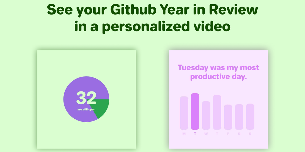 Get your personalized Year in Review video of your GitHub activity. Enter your name and a downloaded video will be generated immediately! Post it on social media using the hashtag #GithubWrapped.