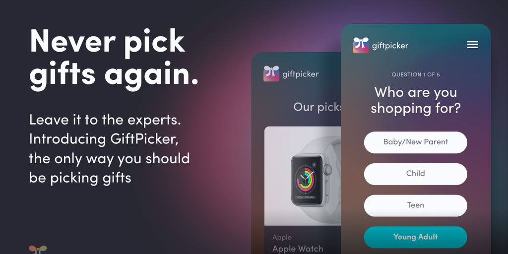 Buzzfeed quiz meets holiday shopping! Introducing GiftPicker 🎁, the easiest way to find the perfect gift. GiftPicker uses a personalized quiz and our epic gift database to find *actually* good gifts for friends & fam. You’ll never have to pick a gift again.