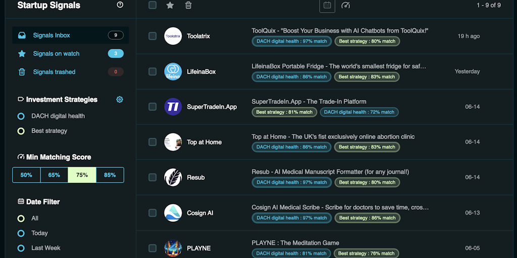 The AI deal sourcing platform for early-stage investors. Never miss a deal within your investment niche with daily signals of early-stage startups, automated processing of decks landing in your inbox,