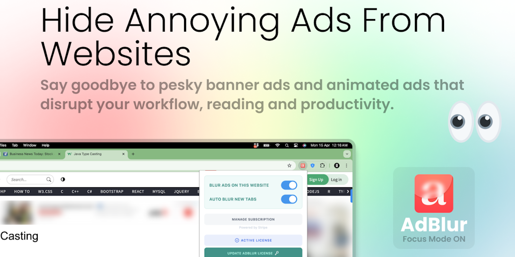 Enhance focus, hide distractions. AdBlur intelligently detects and masks ads in your open browser tabs. Protect privacy during browsing in public and screen recordings. Save Auto-Blur preference acros