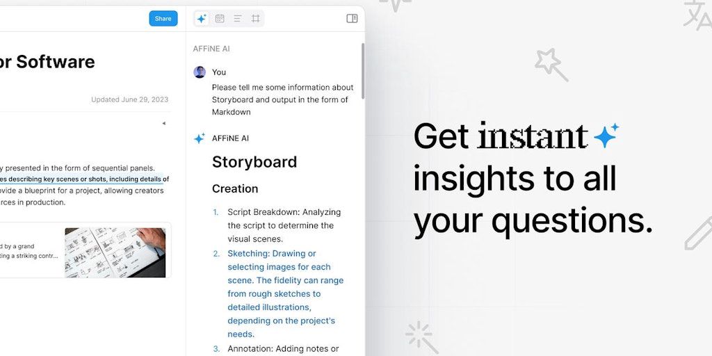 Get instant insights, perfect content, and expand thinking with magic mindmaps and presentation-ready slides. AFFiNE AI lets you think bigger, create faster, work smarter and save time for every proje
