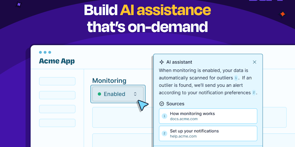 Unblock users and help them succeed with assistance that's on-demand, contextual, always up-to-date, and built seamlessly into your product. This isn’t another chatbot. It’s in-product AI that actuall