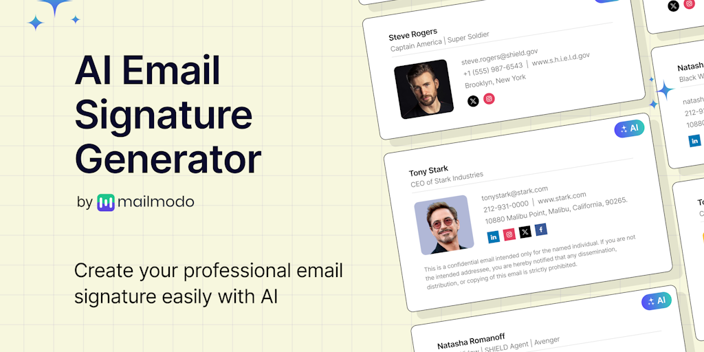 Create professional email signatures with Mailmodo's free AI signature generator compatible with Gmail, Outlook, Yahoo Mail, and more. Zero design bandwidth required.