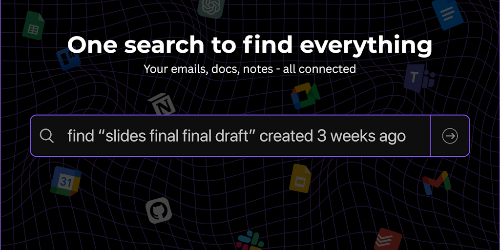 Our AI-powered search connects Gmail, Google Docs, Notion, Obsidian, and more - so you can find anything across all your knowledge sources instantly, from one simple search bar. No more silos, no more