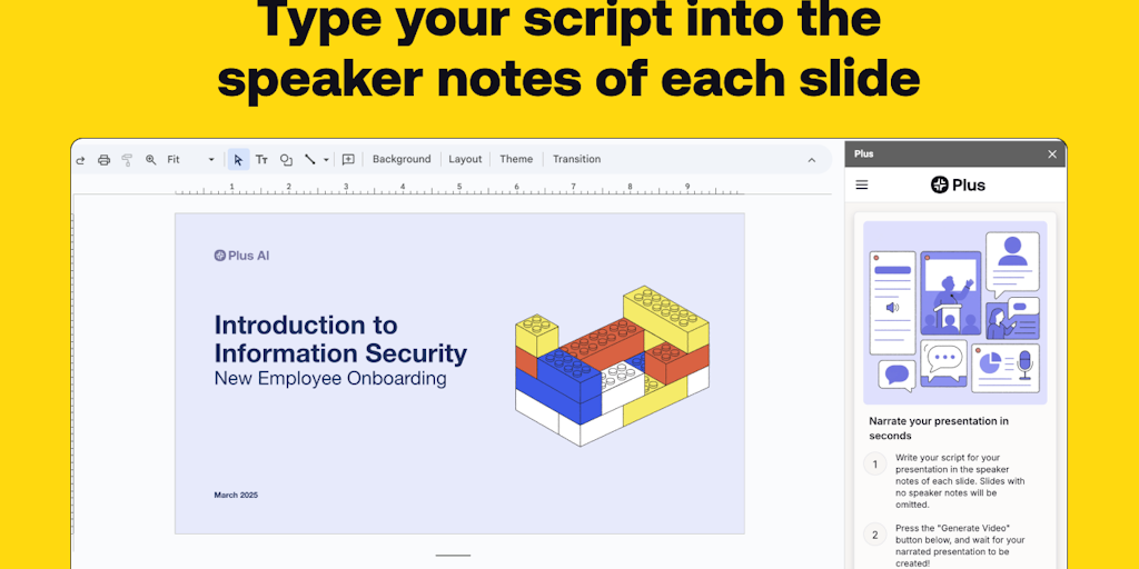 Plus AI's presentation narrator can convert your slide decks into professionally-narrated videos in minutes.