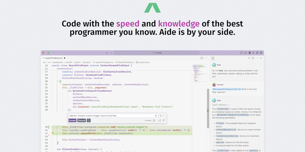 Aide: the ultimate AI-native code editor. Write code faster and better with seamless AI assistance while safeguarding your privacy and maintaining full code ownership through self-hosted models.