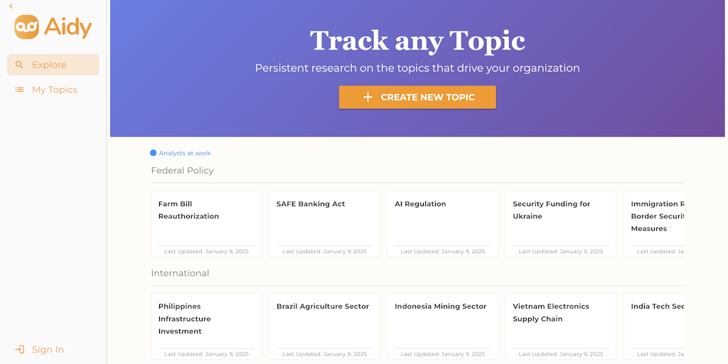 Aidy works around the clock to track and research the issues that drive your organization's decisions. Just define the topics you want to keep track of, and Aidy will alert you every time there's a su