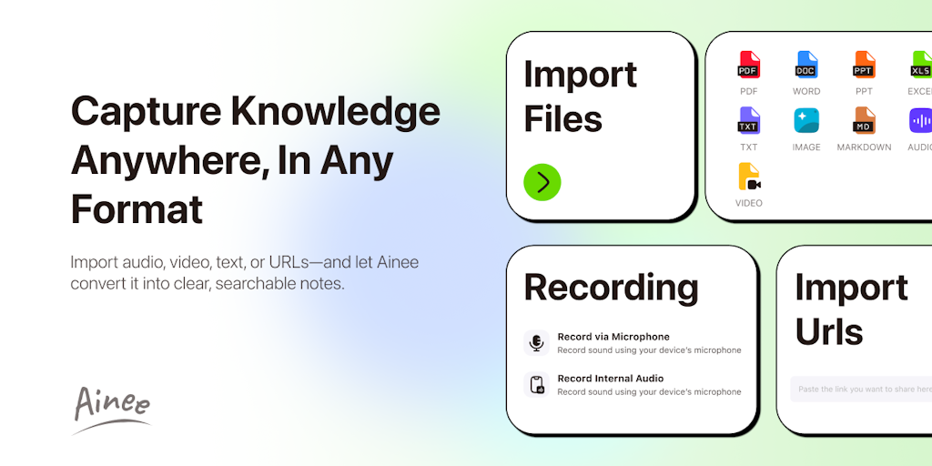 Ainee is your AI-driven notetaking companion for smarter learning. It is designed to transform how you capture, digest, and share knowledge. Capture real-time lecture notes and convert audio, text, f