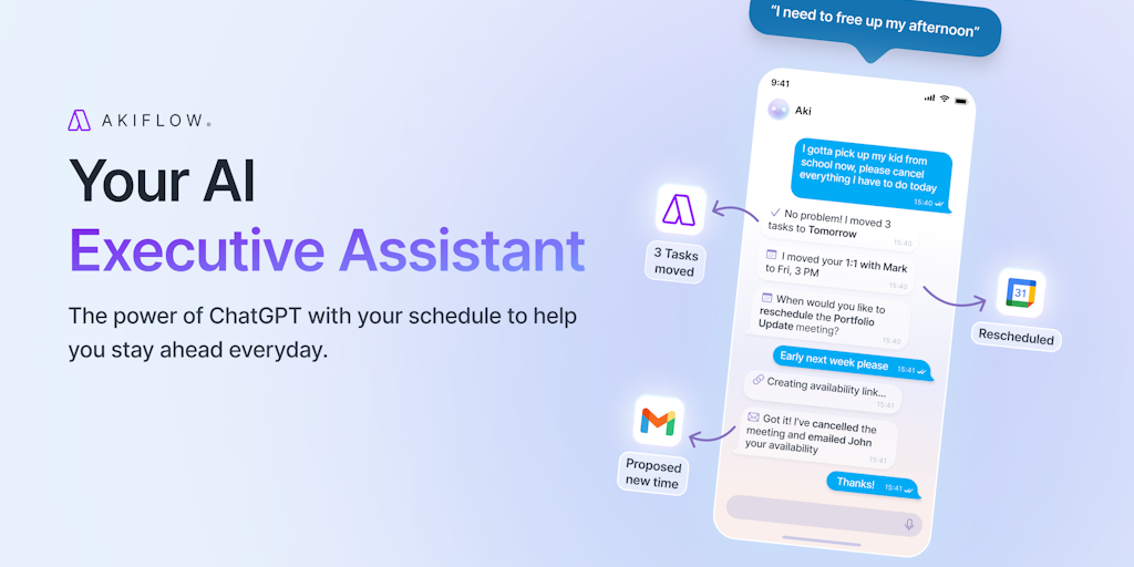 Aki is an AI Executive Assistant, enhancing task and calendar management with the power of LLMs. Automate scheduling, task management and communications, and get real-time productivity support!