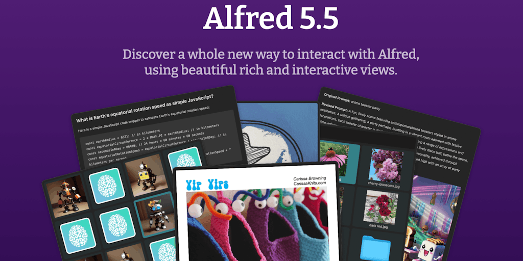 Alfred 5.5 is now available, with the huge exciting addition of the Grid, Text, Image and PDF views that bring your Alfred results to life in a whole new way!