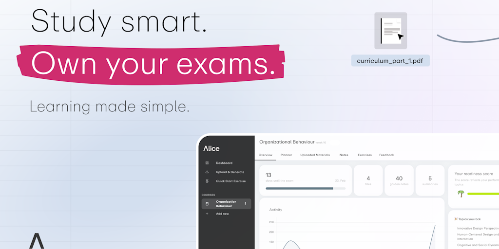 Alice turns generic course materials into personalized learning and exam prep using AI. We're Duolingo for students’ exam prep – and more than 3,000 students have already used Alice to improve their g