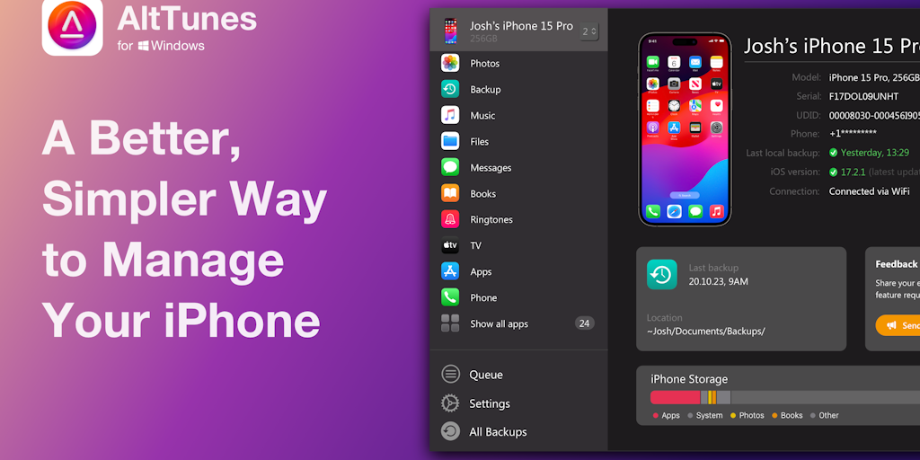 AltTunes — the best backup manager and data transfer tool for your iPhone. It allows you to easily export music, photos, contacts, and more from iPhone to PC. Effortlessly organize and back up your da