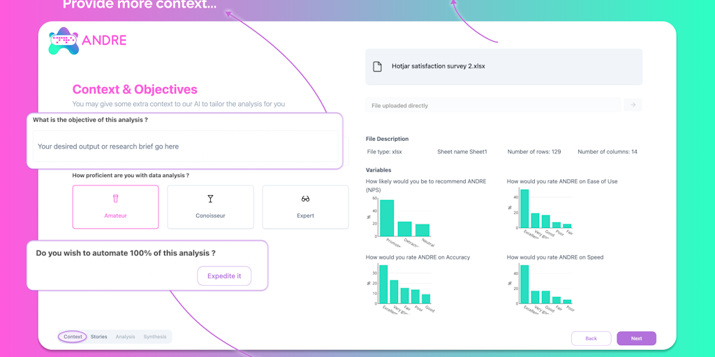 ANDRE is a survey data analysis automation product. It takes tabular data and returns compelling analysis reports with data visualizations and synthesis slides. It makes the analysis process seamless