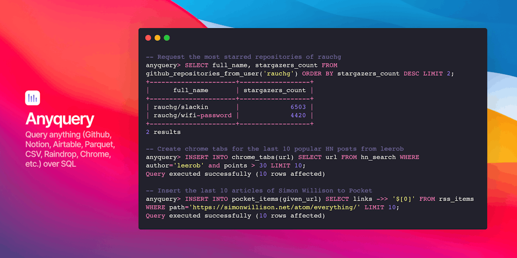 Anyquery - Query anything (Notion, GitHub, CSV, JSON, HN, etc) via SQL | Product Hunt