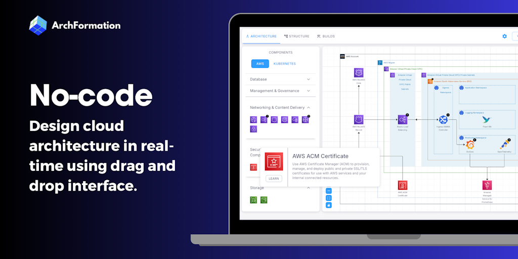 ArchFormation is a self-service app that lets you design and deploy cloud infrastructure in minutes instead of months, even with a limited budget or DevOps resources. Just drag and drop components ont