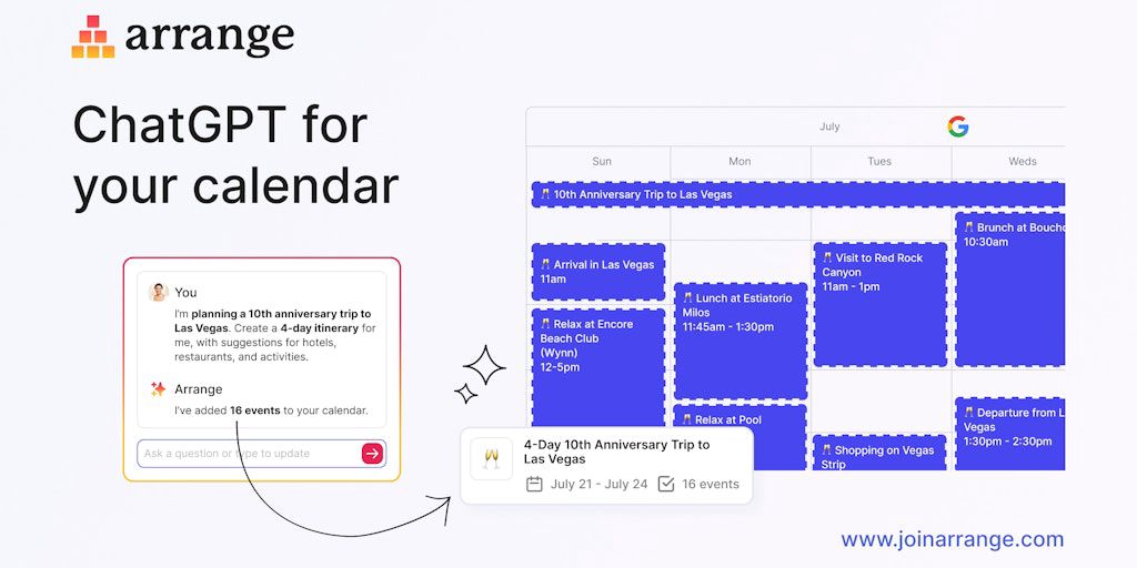 Arrange is an AI-powered copilot that can generate a plan for anything and add it to your calendar in seconds.