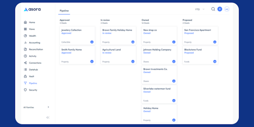 Asora is a SaaS solution for family offices to track and oversee assets, providing a single source of truth for all the family’s data. Manual data handling and report creation is replaced with automat