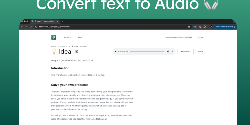 Traditional text-to-speech sounds like a rusty robot from 1950s, but with AI we can do much better. I built this to enjoy new content that wasn't available as audio and would love to share this with y