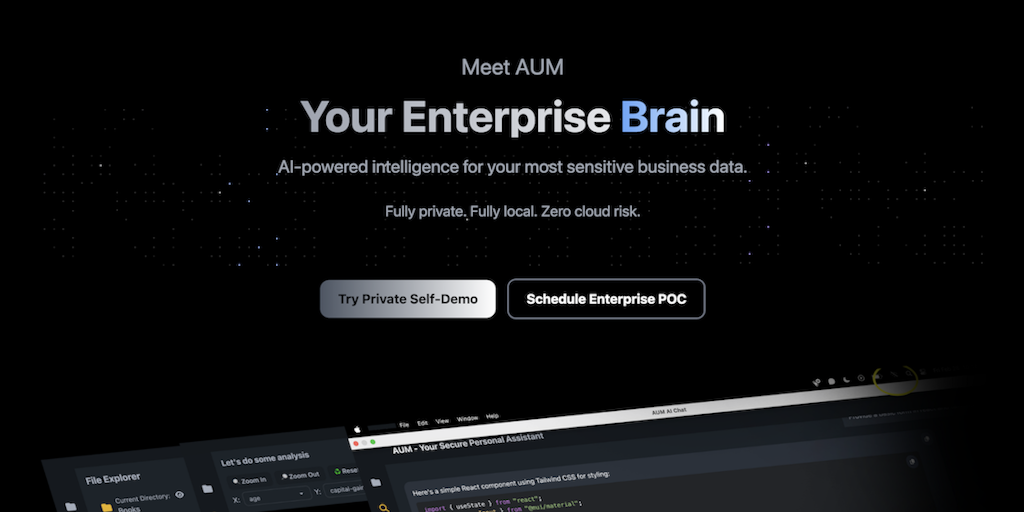 AUM is your fully private enterprise AI brain. Run AI offline on your own infrastructure. Fully private. Fully local. Zero cloud risk. Secure document search, database intelligence, and workflow autom