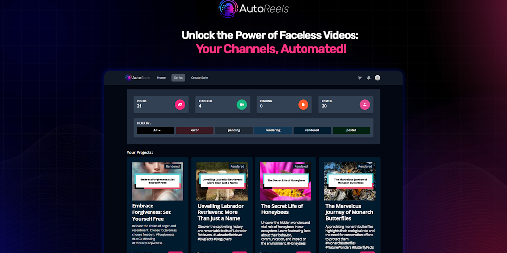 AutoReels - The ultimate tool that easily creates and automates faceless videos In seconds. Simply choose a niche or provide your prompt & the AI will create video series and publish them on social me