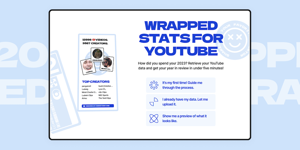 A website that generates your 2023 YouTube Wrapped. See an interactive view for your watching habits and top creators. Share your YouTube Wrapped with friends.