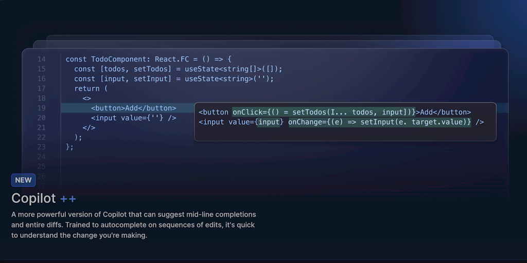 A more powerful version of Copilot that can suggest mid-line completions and entire diffs. Trained to autocomplete on sequences of edits, it's quick to understand the change you're making.