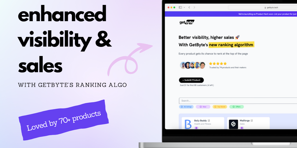 Your ultimate SaaS showcase! Unleash your product's potential with exclusive deals, prime landing page visibility on launch day, and transparent analytics. Elevate your SaaS game – list with GetByte t