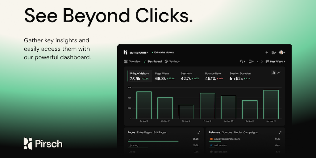 Removing Google Analytics from websites since 2020. Pirsch is a powerful web analytics solution with new white label features, organizations, and an even more powerful dashboard. Get 25% off your firs
