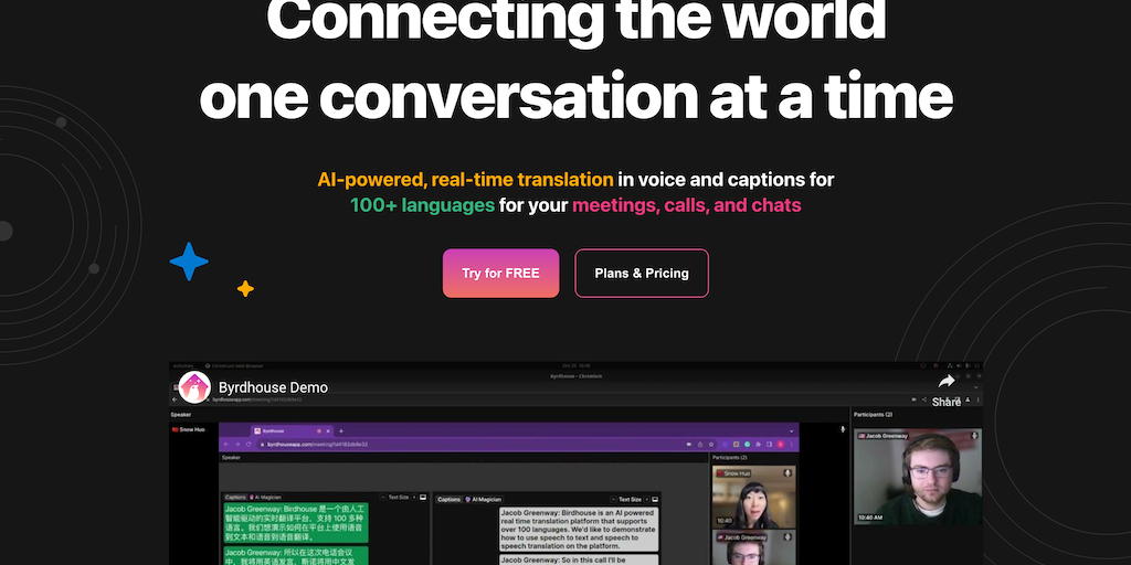 Byrdhouse provides AI-powered, real-time interpretation in voice and captions across 100+ languages for your meetings, calls, and chats. Our mission is to help people who speak different languages bui