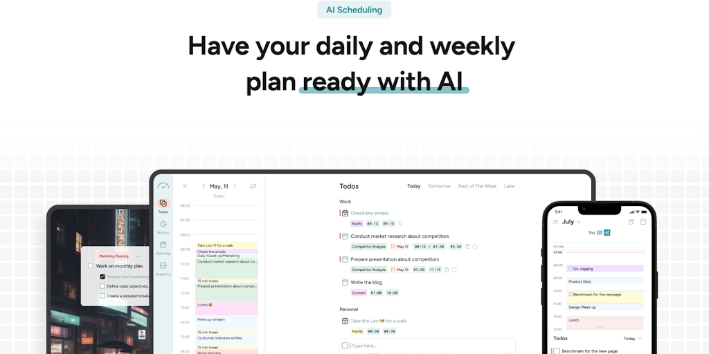 BeforeSunset AI 2.0 offers personalized daily schedules using 5 proven planning techniques. Our AI algorithm crafts your schedule, syncing across web and mobile. Combining tasks, notes, and calendars,