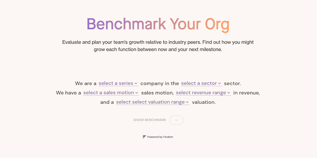 Assess your team's growth against industry peers. Select stage, sector, GTM motion, revenue, and valuation for a bespoke headcount plan. Data is updated monthly from 15K firms that have raised in the