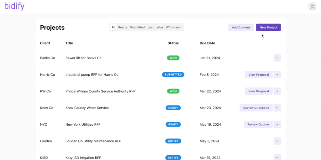 Bidify is the first platform to truly automate proposals for RFPs. Bidify generates high-quality proposals by automatically parsing RFPs, extracting requirements, generating an outline, and drafting t