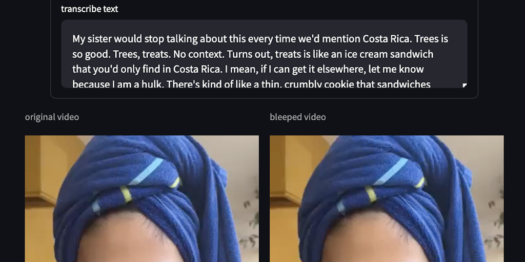 Inspired by a podcast that humorously censored guests with bleep sounds, I thought it would be fun to make an app to let me do the same for any YouTube / uploaded video. The app transcribes your video
