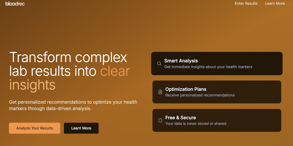 Bloodrec transforms lab results into actionable insights. Upload your bloodwork to instantly see which biomarkers are optimal and which need attention. Get personalized recommendations for out-of-rang