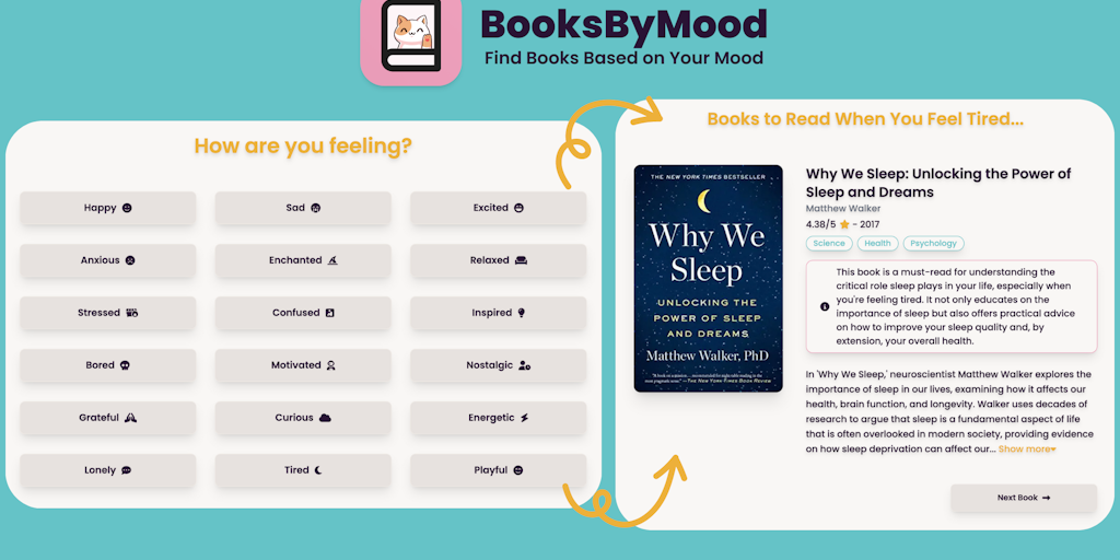 BooksByMood will help you find your next read based on your mood with: 🌟 Books averaging 4.09/5 on Goodreads 📖 Each book comes with an explanation of why it's selected for your mood 😊 18 moods to expl