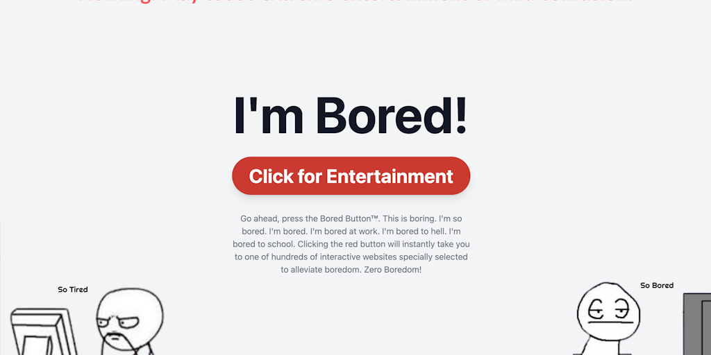 Bored? I am Bored! Press the RED Bored Button™. Instant gratification to kill boredom. We'll take you through the world of internet madness (videos, games, apps and websites).
