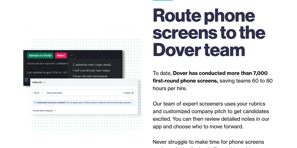 Dover’s Candidate Management product automates scheduling and follow-ups, and conducts first-round phone screens, saving teams 20 to 30 hours per hire. Early adopters have seen incredible success, inc