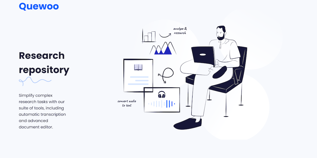 Quewoo streamlines your research project by centralising all your text, audio, and video content. With automatic transcription and a user-friendly editing interface, you can easily categorize and anno