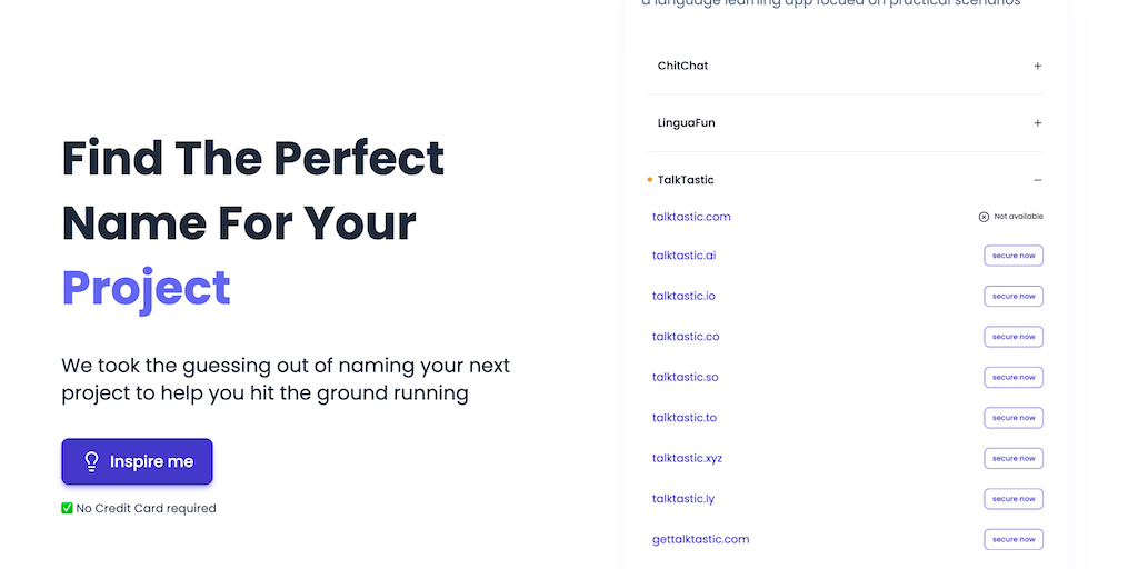 Brainstorm your next project name based on keywords and a description. And check domain availability at a glance