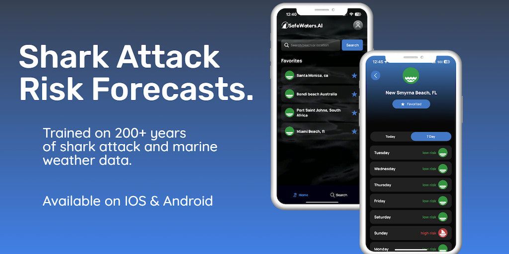 Trained on 200+ years of shark attack and marine weather data, SafeWaters.ai create 7 day attack risk forecasts at any beach. Assess your risk before entering the water. This is great for surfers, loc