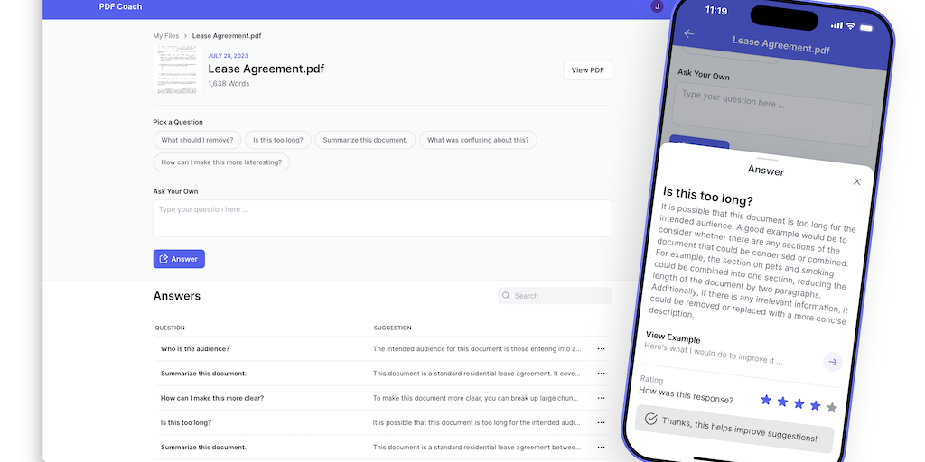 PDF Coach is a mobile and desktop web app built with AI that helps you quickly improve what you're working on and impress your boss. Upload a PDF or paste something you're working on and get amazing A