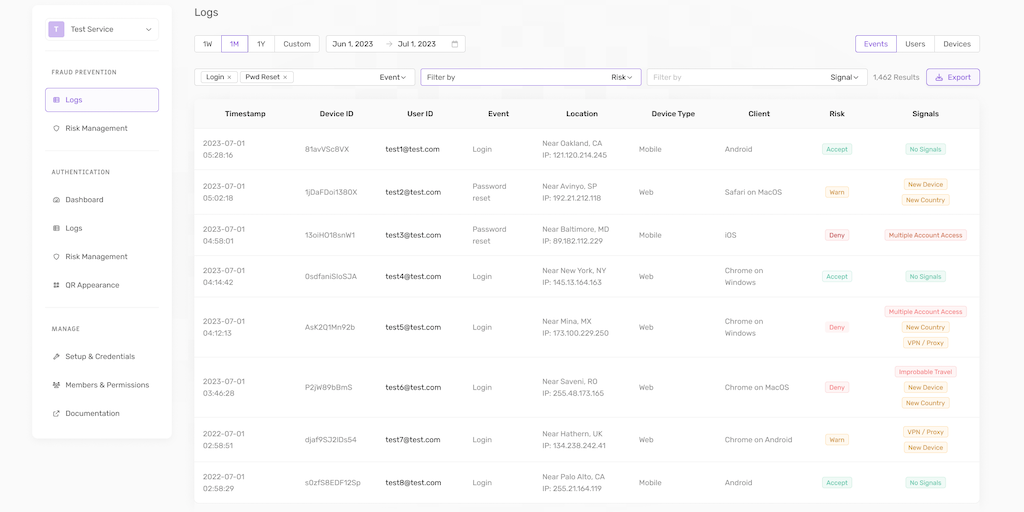 Keyri's risk-based authentication solution provides real time signals for fraud determination by monitoring high risk user events across devices, sessions, and locations, with customizable risk rules
