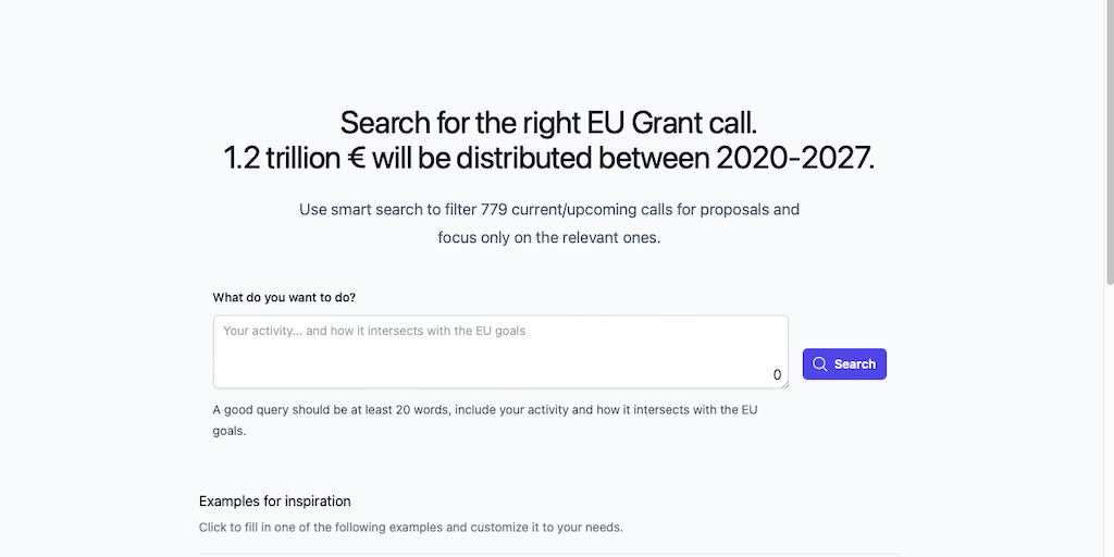NLP based smart search engine for EU grants. 1.2 trillion € will be distributed between 2020-2027. Find relevant grants in seconds, send more proposals and increase your odds of success.