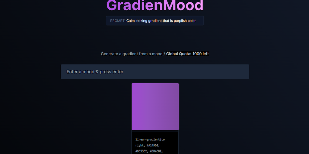 GradienMood is a tool to generate gradients from your mood. Simply enter your mood (ex- Happy and funny world) and the AI magic will generate a CSS gradient for you.