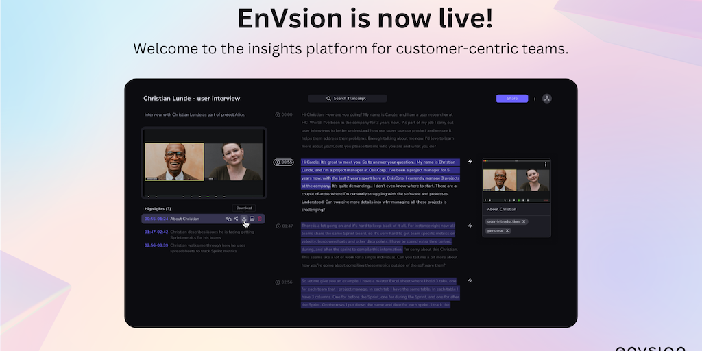 EnVsion helps customer-facing teams save time finding and sharing key learnings from videos of customer conversations in order to build market-dominating products.