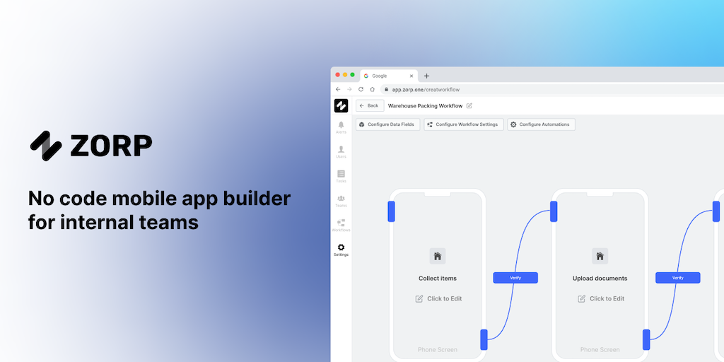 Zorp empowers everyone to build powerful, scalable android and iOS applications for their internal teams in minutes. No coding required. Design visually, integrate your APIs and 1-click publish to pla
