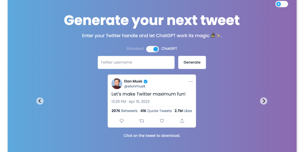 Improve your Twitter game with AI-powered tools. Generate realistic tweets based on your Twitter activity with ChatGPT, stay up-to-date on the latest trends, and effortlessly create trendy content to