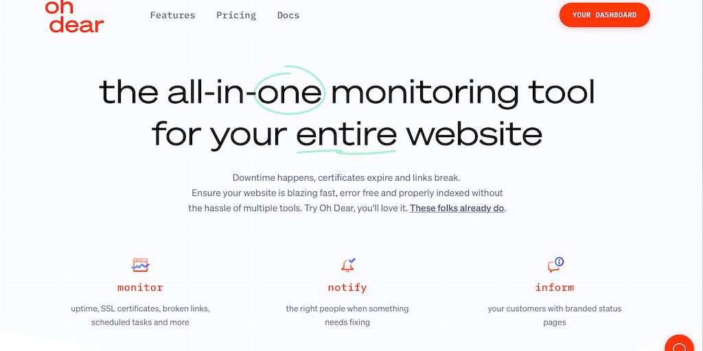 Oh Dear is a next-gen monitoring service. We don't only ping your homepage but crawl your entire site and report broken links. We also offer SSL checks, make sure your scheduled jobs run on time. We a